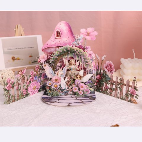Carte 3D créative et mignonne fée maison champignon maison avec de belles fleurs double porte carte de voeux pop-up 3D